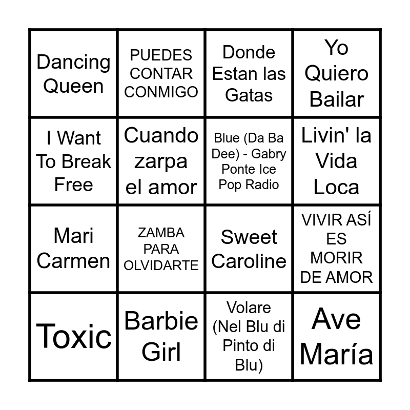 This bingo card has 90 words: LUNA TUCUMANA, GARGANTA CON ARENA, ROSA, ROSA, A DON ATA, MI BUENOS AIRES QUERIDO, A MI MANERA, TE QUIERO TANTO, PEGA LA VUELTA, ZAMBA DE MI ESPERANZA, AMOR SALVAJE, QUE NADIE SEPA MI SUFRIR, LA POLLERA AMARILLA, BOMBÓN ASESINO, ZAMBA PARA OLVIDARTE, ETERNO AMOR, VIVIR ASÍ ES MORIR DE AMOR, DESPEINADA, CARNAVAL, MARINERO DE LUCES, DAME FUEGO, Video Killed The Radio Star, Girls Just Want to Have Fun, L'Empordà, I Will Survive, I Want To Break Free, A quién le importa, I Gotta Feeling, Call Me Maybe, Baby, Wannabe, Single Ladies (Put a Ring on It), All Star, Milionària, Barbie Girl, Donde Estan las Gatas, Yo Quiero Bailar, Dancing Queen, All I Want for Christmas Is You, Sweet Caroline, KITT y los coches del pasado, Toxic, Cuando zarpa el amor, Dragostea din tei, Coti x Coti, Quevedo: Bzrp Music Sessions, Vol. 52, Waka Waka (Esto es Africa) (feat. Freshlyground), Hakuna Matata, Ay Mamá, La Vida Es Un Carnaval, Everybody (Backstreet's Back) - Radio Edit, Física o química, Ave María, Por la Raja de Tu Falda, Party In The U.S.A., La Revolución Sexual, Flying Free - Original Mix, Mari Carmen, Rayos de Sol, Sarà perché ti amo, Doraemon (El Gat Còsmic), Breaking Free, Esbarzers (Remix), You're The One That I Want, Shake It Off, LA MARINA STA MORENA, Si Antes Te Hubiera Conocido, LA FALDA, Bon Dia, Hips Don't Lie (feat. Wyclef Jean), La Camisa Negra, Volare (Nel Blu di Pinto di Blu), Wonderwall, Levitating, Freed From Desire - prod. Molella, Phil Jay, Blue (Da Ba Dee) - Gabry Ponte Ice Pop Radio, Livin' la Vida Loca, Summercat, Atrévete-Te-Te, Benvolgut, A la sombra de la sierra, Zeinen Ederra Izango Den, PUEDES CONTAR CONMIGO, Rosas, Todos los días sale el sol, DESPECHÁ, I'll Be There for You - Theme From Friends, Murder On The Dancefloor, Complicated, Conga and Mon Amour - Remix.