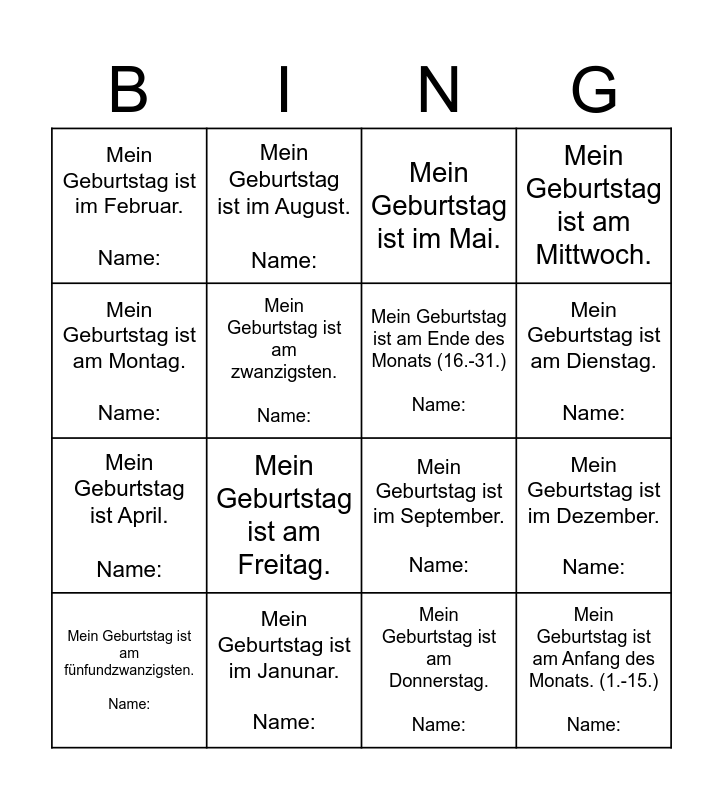 This bingo card has 16 words: Mein Geburtstag ist im Janunar. Name:, Mein Geburtstag ist im Dezember. Name:, Mein Geburtstag ist im Mai., Mein Geburtstag ist im Februar. Name:, Mein Geburtstag ist April. Name:, Mein Geburtstag ist im August. Name:, Mein Geburtstag ist im September. Name:, Mein Geburtstag ist am Donnerstag. Name:, Mein Geburtstag ist am Montag. Name:, Mein Geburtstag ist am zwanzigsten. Name:, Mein Geburtstag ist am fünfundzwanzigsten. Name:, Mein Geburtstag ist am Mittwoch., Mein Geburtstag ist am Freitag., Mein Geburtstag ist am Dienstag. Name:, Mein Geburtstag ist am Ende des Monats (16.-31.) Name: and Mein Geburtstag ist am Anfang des Monats. (1.-15.) Name:.