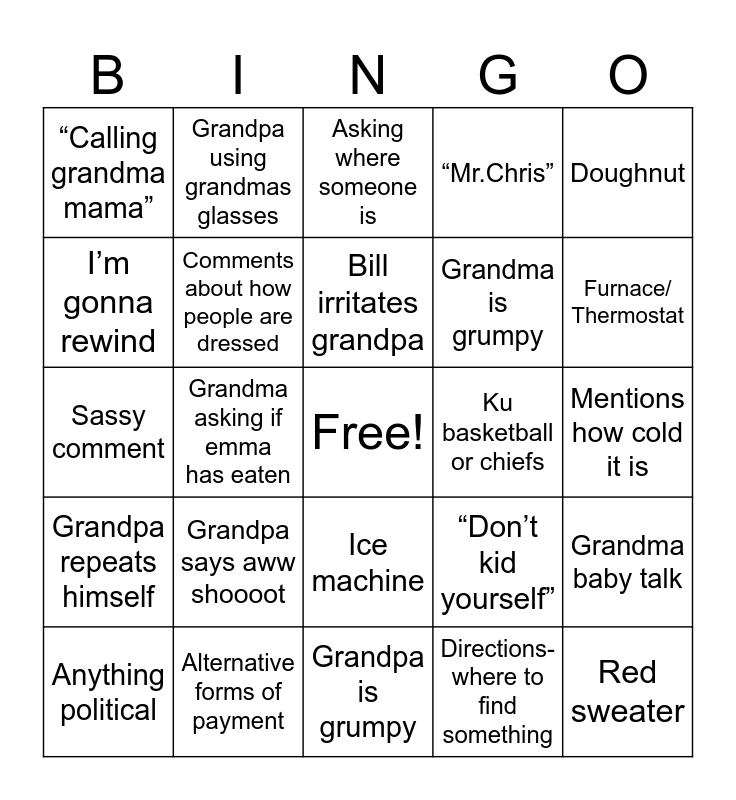 This bingo card has a free space and 27 words: “Don’t kid yourself”, credit card chip, Grandma is grumpy, Grandpa is grumpy, I’m gonna rewind, Asking where someone is, Grandpa using grandmas glasses, Grandpa repeats himself, Ku basketball or chiefs, Grandma baby talk, Sassy comment, “Mr.Chris”, Anything political, Alternative forms of payment, Furnace/ Thermostat, Grandma is wearing tight pants, Comments about how people are dressed, Bill irritates grandpa, Grandpa says aww shoooot, “Calling grandma mama”, Mentions how cold it is, Directions-where to find something, Grandma asking if emma has eaten, Red sweater, Ice machine, Doughnut and Any deal.