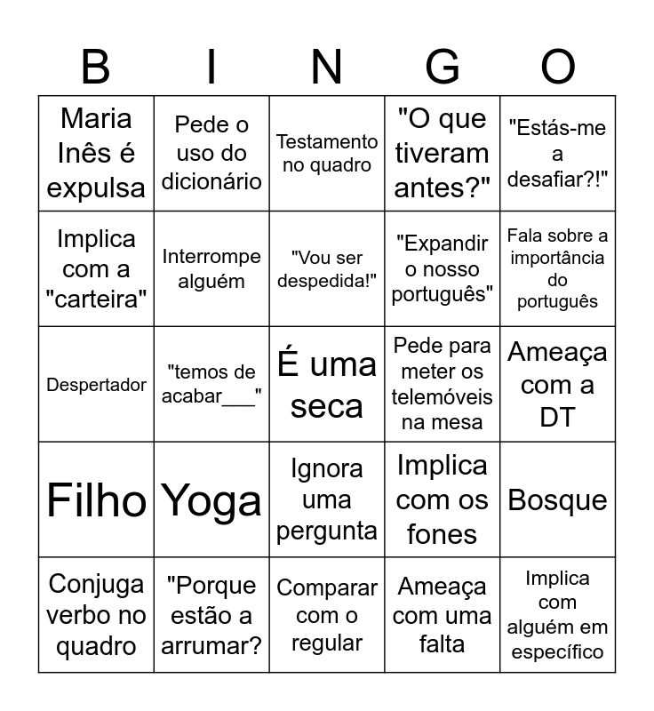 This bingo card has a free space and 31 words: Comparar com o regular, Olhar para o livro de exame, "temos de acabar___", "temos de avançar com a matéria", Maria Inês é expulsa, Testamento no quadro, Interrompe alguém, Implica com os fones, Pede para meter os telemóveis na mesa, Ameaça com uma falta, Ameaça com a DT, Implica com alguém em específico, "estás doente?", Fala sobre algo sem relação à aula, Fala sobre a importância do português, Abre o inovar para marcar falta, Bosque, Yoga, Filho, Ignora uma pergunta, "Estás-me a desafiar?!", Reclama com as festividades ou profissional, Conjuga verbo no quadro, Pede o uso do dicionário, "Expandir o nosso português", Implica com a "carteira", "O que tiveram antes?", Despertador, "Porque estão a arrumar?, "Vou ser despedida!" and "Se não entenderem a palavra, não entendem a frase...".