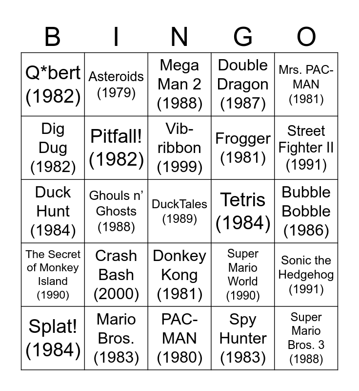 This bingo card has a free space and 24 words: Crash Bash (2000), Mario Bros. (1983), Vib-ribbon (1999), Splat! (1984), Mrs. PAC-MAN (1981), Q*bert (1982), Dig Dug (1982), Asteroids (1979), Tetris (1984), Donkey Kong (1981), Frogger (1981), Duck Hunt (1984), Super Mario World (1990), Sonic the Hedgehog (1991), Pitfall! (1982), Spy Hunter (1983), Bubble Bobble (1986), Mega Man 2 (1988), Street Fighter II (1991), Ghouls nā Ghosts (1988), Super Mario Bros. 3 (1988), The Secret of Monkey Island (1990), Double Dragon (1987) and PAC-MAN (1980).