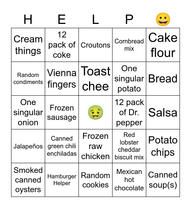 This bingo card has a free space and 24 words: Canned green chili enchiladas, Hamburger Helper, Toast chee, Smoked canned oysters, Cake flour, Cream things, Random condiments, 12 pack of coke, 12 pack of Dr. pepper, Frozen raw chicken, One singular potato, One singular onion, Red lobster cheddar biscuit mix, Potato chips, Vienna fingers, Mexican hot chocolate, Salsa, Croutons, Bread, Frozen sausage, Canned soup(s), JalapeΓ±os, Cornbread mix and Random cookies.