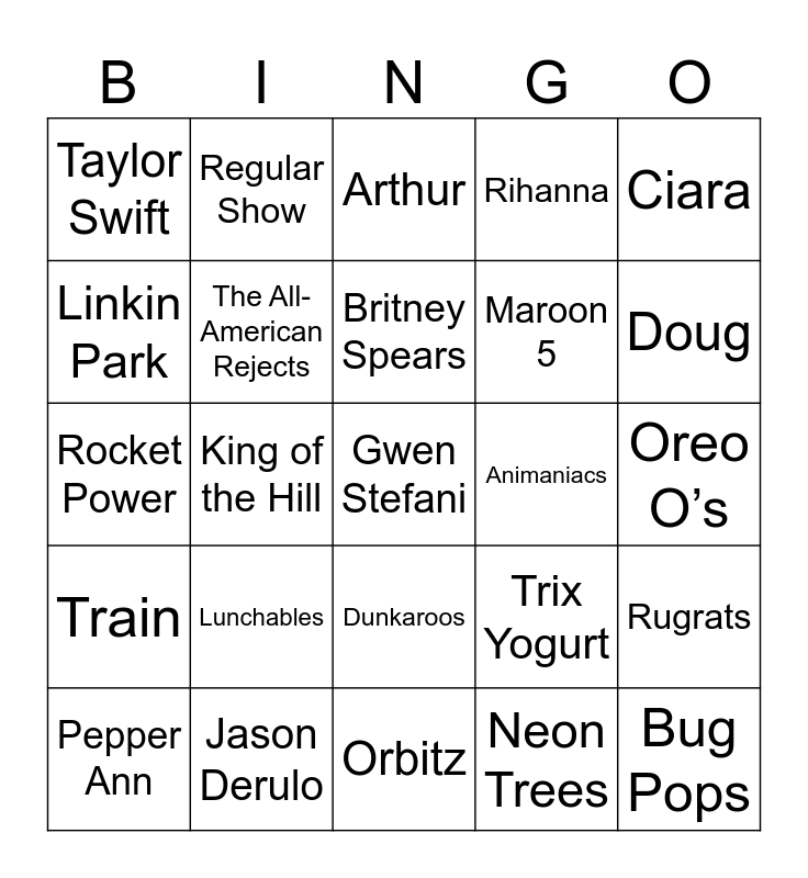 This bingo card has 60 words: Sean Kingston, Jason Derulo, Flo Rida, Train, Neon Trees, Nelly, The All-American Rejects, Black Eyed Peas, Maroon 5, Timbaland, Rihanna, Gnarls Barkley, Linkin Park, The Fray, Bowling for Soup, Taylor Swift, Gwen Stefani, Ciara, Justin Timberlake, Britney Spears, Animaniacs, Arthur, Pepper Ann, Rugrats, Hey Arnold!, Garfield, Max & Ruby, Winnie the Pooh, Doug, Teacher’s Pet, Rocko’s Modern Life, CatDog, Ren & Stimpy, Chowder, Regular Show, Clifford’s Puppy Days, Recess, King of the Hill, Pinky and the Brain, Rocket Power, Squeezeit, Lunchables, Oreo O’s, Warheads, Trix Yogurt, 3D Doritos, Bubble Jug, P.B. Crisps, Surge, Dunkaroos, Orbitz, Ring Pops, Butterfinger BBs, Gushers, Mr. Pibb, Ecto Cooler, Fruitopia, Choco Taco, Bug Pops and Wonder Ball.