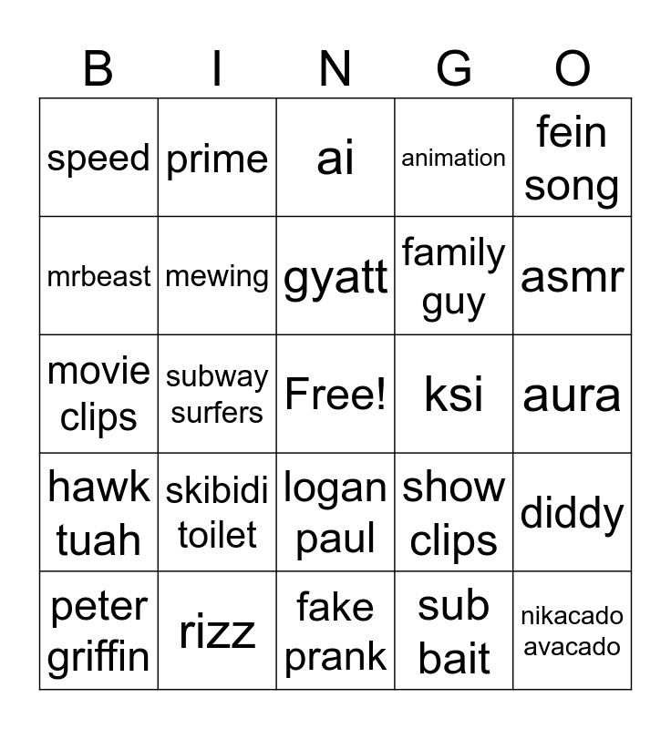 This bingo card has a free space and 24 words: skibidi toilet, rizz, gyatt, peter griffin, fein song, speed, mrbeast, prime, ksi, logan paul, family guy, movie clips, show clips, diddy, mewing, sub bait, aura, ai, asmr, subway surfers, nikacado avacado, hawk tuah, animation and fake prank.