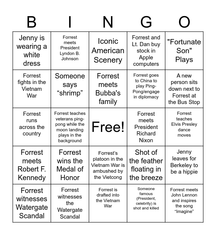 This bingo card has a free space and 34 words: Forrest named after KKK founder Nathan Bedford Forrest, Anti-War Protest in D.C., Jenny dies of an unknown disease (likely AIDS), University of Alabama integrates, Forrest teaches Elvis Presley dance moves, Forrest fights in the Vietnam War, Someone says “shrimp”, Forrest is drafted into the Vietnam War, Forrest goes to China to play Ping-Pong/engage in diplomacy, Forrest meets John Lennon and inspires the song “Imagine”, Forrest runs across the country, Forrest meets President Lyndon B. Johnson, Someone famous (President, celebrity) is shot and killed, Forrest meets JFK, Forrest meets Robert F. Kennedy, Forrest teaches veterans ping-pong while the moon landing plays in the background, Forrest’s platoon in the Vietnam War is ambushed by the Vietcong, Forrest meets President Richard Nixon, Jenny leaves for Berkeley to be a hippie, Forrest witnesses Watergate Scandal, Forrest witnesses the Watergate Scandal, Forrest meets a member of the Black Panther Party, Forrest and Lt. Dan buy stock in Apple computers, A new person sits down next to Forrest at the Bus Stop, Forrest says "life is like a box of chocolates", Forrest wins the Medal of Honor, Iconic American Scenery, "Sweet Home Alabama" Plays, "Fortunate Son" Plays, Jenny is wearing a white dress, Someone shouts "Run, Forrest, Run!", Forrest meets Bubba's family, Shot of the feather floating in the breeze and Someone on the bus says "seat's taken".