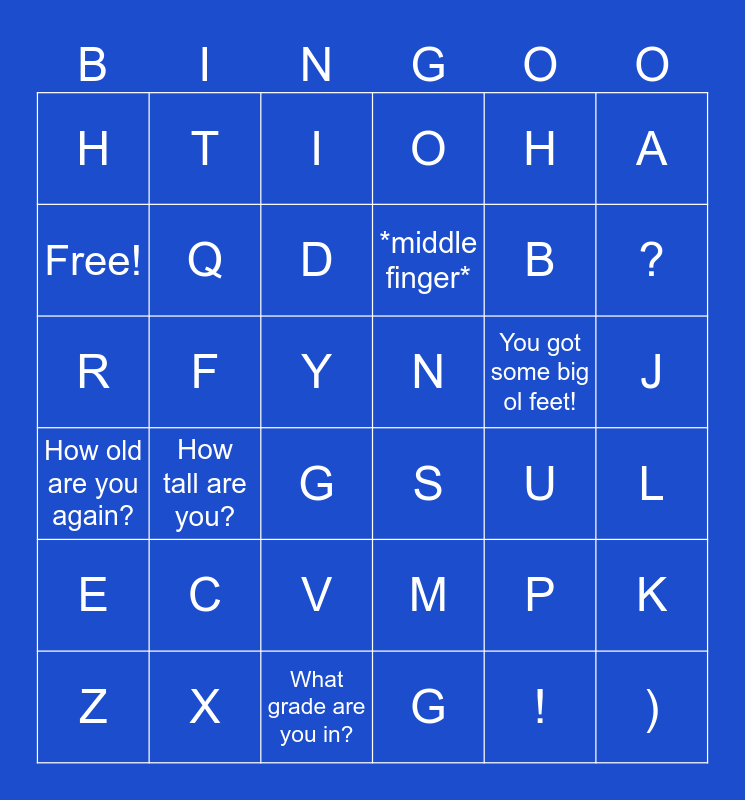 This bingo card has 36 words: How old are you again?, How tall are you?, What grade are you in?, *middle finger*, You got some big ol feet!, J, H, X, I, M, B, A, E, F, D, O, P, L, Free!, Q, G, S, U, K, R, T, Y, G, H, ?, Z, C, V, N, ! and ).