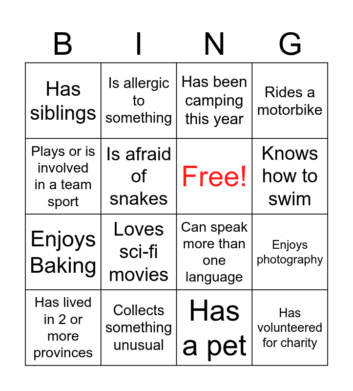 This bingo card has 16 words: Has lived in 2 or more provinces, Collects something unusual, Has been camping this year, Rides a motorbike, Plays or is involved in a team sport, Is allergic to something, Can speak more than one language, Enjoys photography, Has siblings, Is afraid of snakes, Has a pet, Knows how to swim, Enjoys Baking, Loves sci-fi movies, Free! and Has volunteered for charity.