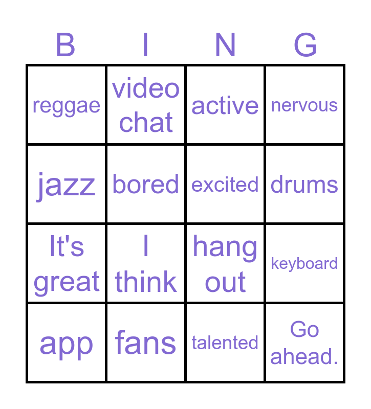 This bingo card has 50 words: Free!, app, device, emoji, screen, social media, video chat, angry, bored, embarrassed, excited, nervous, upset, bass guitar, country, DJ, drums, fans, heavy metal, jazz, keyboard, rap, reggae, It's great, In my opinion, a couple of problems, I think, I really recommend it., active, ambitious, calm, cheerful, confident, helpful, inspiring, patient, sensible, sensitive, sociable, talented, cheer somebody up, deal with, depend on, get along with, give up, hang out, look up to, take care of, Go ahead. and Good for (her)!.