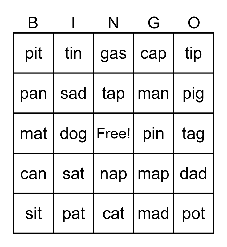 This bingo card has a free space and 24 words: sat, pat, tap, sit, tip, pit, pan, tin, pin, nap, man, mat, map, dad, sad, mad, tag, gas, pig, dog, pot, can, cap and cat.