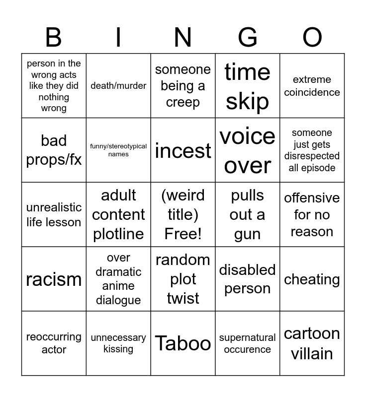 This bingo card has a free space and 24 words: over dramatic anime dialogue, unnecessary kissing, incest, reoccurring actor, extreme coincidence, person in the wrong acts like they did nothing wrong, bad props/fx, death/murder, pulls out a gun, random plot twist, voice over, unrealistic life lesson, disabled person, cheating, funny/stereotypical names, supernatural occurence, offensive for no reason, someone being a creep, someone just gets disrespected all episode, adult content plotline, cartoon villain, racism, time skip and Taboo.