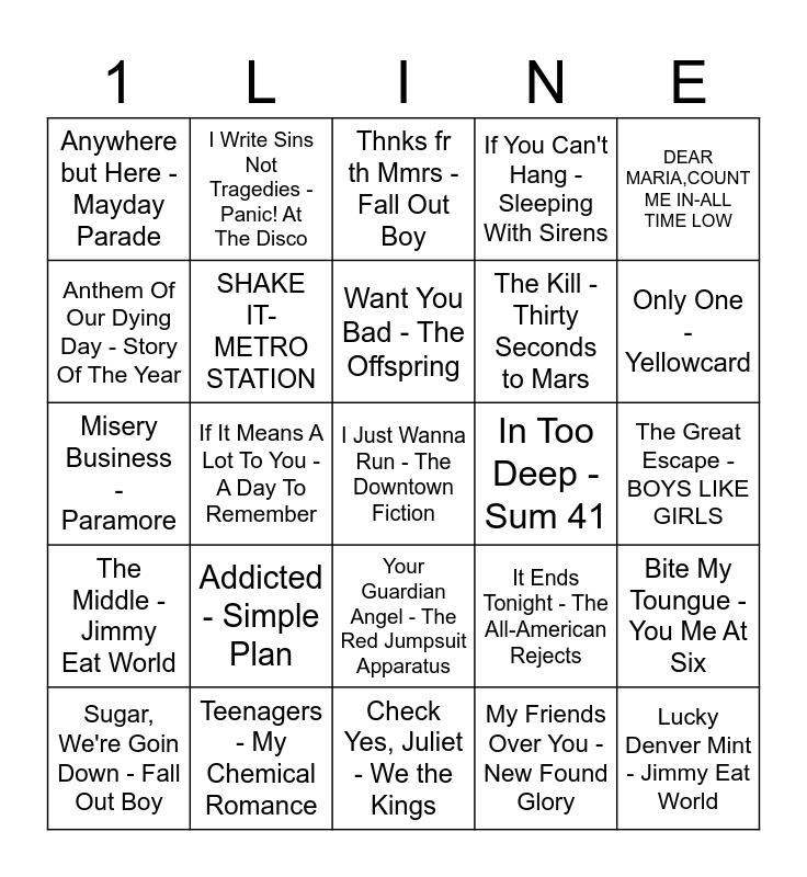 This bingo card has 33 words: Lucky Denver Mint - Jimmy Eat World, FAT LIP- SUM 41, If It Means A Lot To You - A Day To Remember, Ohio Is For Lovers - Hawthorne Heights, The Middle - Jimmy Eat World, SHAKE IT- METRO STATION, DEAR MARIA,COUNT ME IN-ALL TIME LOW, Sugar, We're Goin Down - Fall Out Boy, I Write Sins Not Tragedies - Panic! At The Disco, I Miss You - blink-182, Want You Bad - The Offspring, Thnks fr th Mmrs - Fall Out Boy, Miss Murder - AFI, Face Down - The Red Jumpsuit Apparatus, In Too Deep - Sum 41, Only One - Yellowcard, Teenagers - My Chemical Romance, Misery Business - Paramore, Addicted - Simple Plan, It Ends Tonight - The All-American Rejects, Your Guardian Angel - The Red Jumpsuit Apparatus, Not Good Enough For Truth In Cliche - Escape The Fate, Anywhere but Here - Mayday Parade, The Great Escape - BOYS LIKE GIRLS, Check Yes, Juliet - We the Kings, I Just Wanna Run - The Downtown Fiction, If You Can't Hang - Sleeping With Sirens, The Kill - Thirty Seconds to Mars, Anthem Of Our Dying Day - Story Of The Year, Bite My Toungue - You Me At Six, Jesus Of Suburbia - Green Day, My Friends Over You - New Found Glory and Fall For You - Secondhand Serinade.