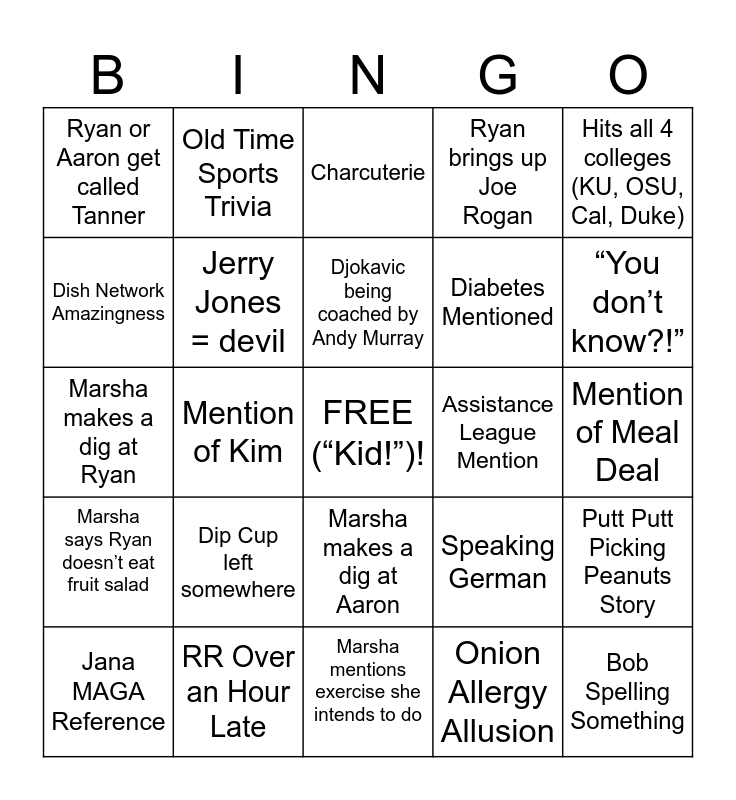 This bingo card has a free space and 24 words: Dip Cup left somewhere, RR Over an Hour Late, Djokavic being coached by Andy Murray, Jana MAGA Reference, Hits all 4 colleges (KU, OSU, Cal, Duke), Ryan or Aaron get called Tanner, Dish Network Amazingness, Old Time Sports Trivia, Assistance League Mention, Marsha makes a dig at Aaron, Diabetes Mentioned, Marsha makes a dig at Ryan, Speaking German, Putt Putt Picking Peanuts Story, Jerry Jones = devil, Onion Allergy Allusion, Mention of Meal Deal, Charcuterie, “You don’t know?!”, Mention of Kim, Bob Spelling Something, Marsha says Ryan doesn’t eat fruit salad, Ryan brings up Joe Rogan and Marsha mentions exercise she intends to do.