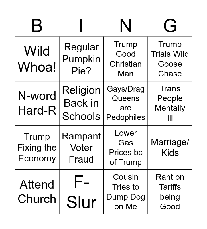 This bingo card has 16 words: F-Slur, Marriage/ Kids, Trump Good Christian Man, Wild Whoa!, Trump Fixing the Economy, Regular Pumpkin Pie?, Lower Gas Prices bc of Trump, Cousin Tries to Dump Dog on Me, N-word Hard-R, Religion Back in Schools, Attend Church, Trump Trials Wild Goose Chase, Rampant Voter Fraud, Trans People Mentally Ill, Gays/Drag Queens are Pedophiles and Rant on Tariffs being Good.