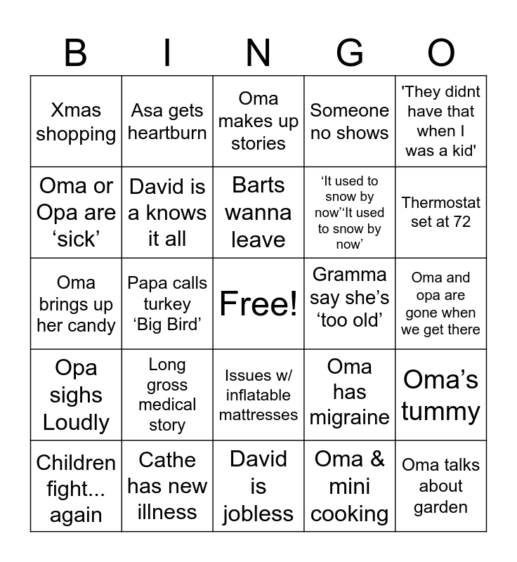 This bingo card has a free space and 28 words: Oma’s tummy, Opa rolls eye, ‘It used to snow by now’‘It used to snow by now’, Oma & mini cooking, Oma or Opa are ‘sick’, Oma makes up stories, Asa gets heartburn, Opa sighs Loudly, Gramma say she’s ‘too old’, Children fight... again, Oma brings up her candy, Someone no shows, Cathe has new illness, David is jobless, Thermostat set at 72, Kenny’s new GF is his ex wife, Long gross medical story, David is a knows it all, Barts wanna leave, Issues w/ inflatable mattresses, Xmas shopping, Opa tells someone off for football, Oma talks about garden, Papa calls turkey ‘Big Bird’, Oma and opa are gone when we get there, Oma has migraine, 'They didnt have that when I was a kid' and House upgrades.