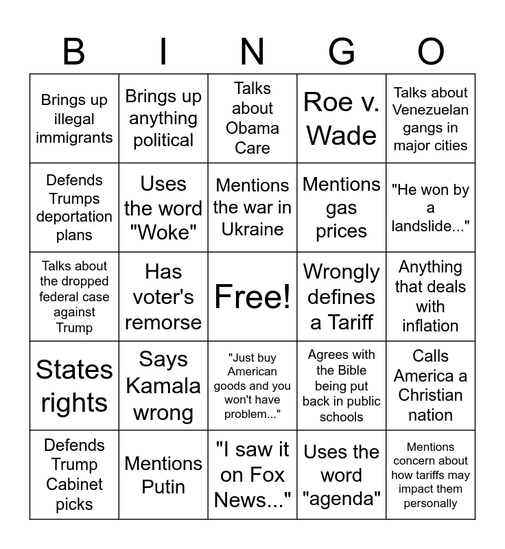 This bingo card has a free space and 24 words: Says Kamala wrong, Mentions Putin, Mentions the war in Ukraine, Defends Trump Cabinet picks, Talks about Venezuelan gangs in major cities, Brings up illegal immigrants, Defends Trumps deportation plans, Brings up anything political, Wrongly defines a Tariff, "Just buy American goods and you won't have problem...", Mentions gas prices, Talks about the dropped federal case against Trump, Agrees with the Bible being put back in public schools, Calls America a Christian nation, Uses the word "Woke", Uses the word "agenda", Anything that deals with inflation, Talks about Obama Care, "He won by a landslide...", Has voter's remorse, Mentions concern about how tariffs may impact them personally, States rights, Roe v. Wade and "I saw it on Fox News...".