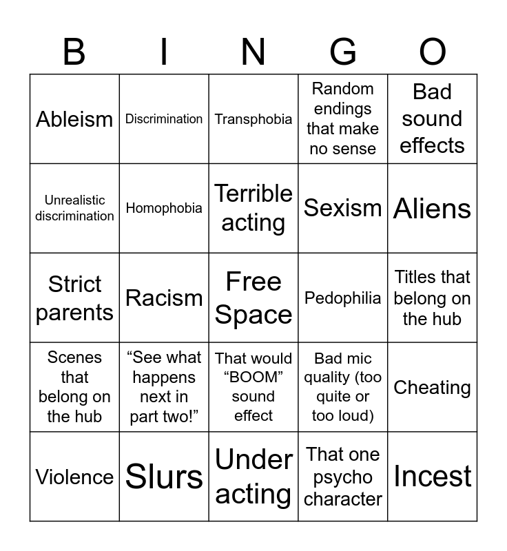 This bingo card has a free space and 24 words: “See what happens next in part two!”, Slurs, Terrible acting, Violence, Bad sound effects, Ableism, Unrealistic discrimination, Discrimination, Pedophilia, That would “BOOM” sound effect, Sexism, Strict parents, Bad mic quality (too quite or too loud), Cheating, Homophobia, That one psycho character, Titles that belong on the hub, Transphobia, Aliens, Racism, Incest, Scenes that belong on the hub, Random endings that make no sense and Under acting.
