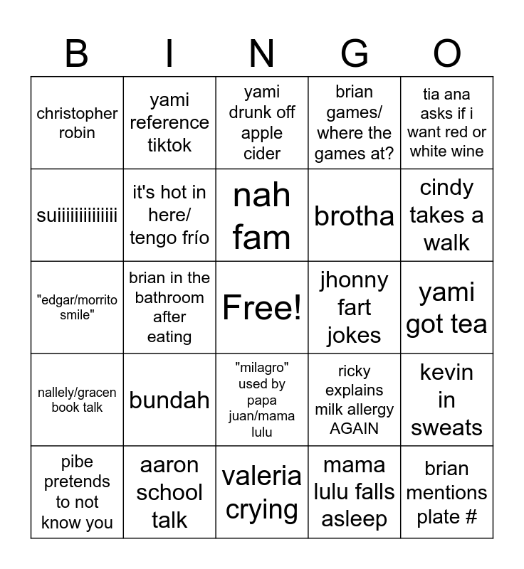 This bingo card has a free space and 24 words: bundah, aaron school talk, nah fam, pibe pretends to not know you, tia ana asks if i want red or white wine, christopher robin, suiiiiiiiiiiiiii, yami reference tiktok, jhonny fart jokes, "milagro" used by papa juan/mama lulu, brotha, "edgar/morrito smile", ricky explains milk allergy AGAIN, kevin in sweats, it's hot in here/ tengo frío, mama lulu falls asleep, yami got tea, yami drunk off apple cider, cindy takes a walk, brian in the bathroom after eating, brian mentions plate #, nallely/gracen book talk, brian games/ where the games at? and valeria crying.