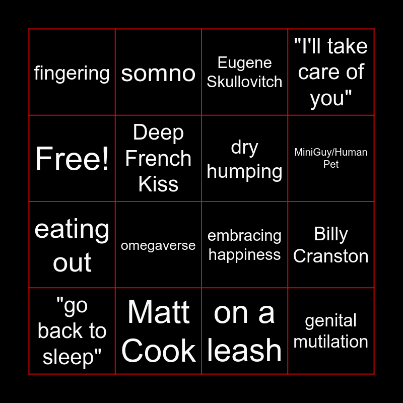 This bingo card has 16 words: Matt Cook, Billy Cranston, Eugene Skullovitch, fingering, eating out, somno, embracing happiness, on a leash, Free!, Deep French Kiss, "go back to sleep", "I'll take care of you", omegaverse, MiniGuy/Human Pet, dry humping and genital mutilation.