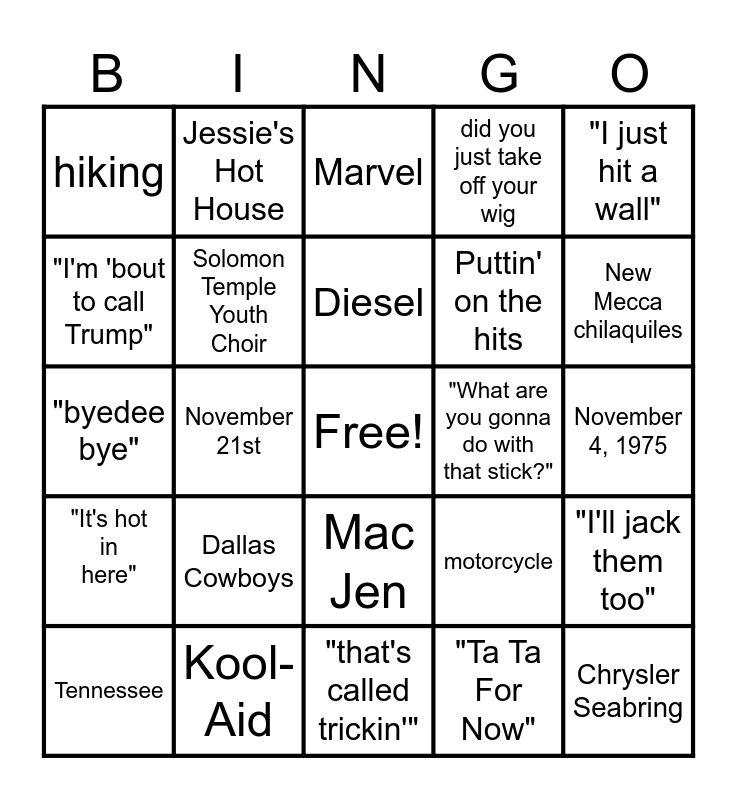 This bingo card has a free space and 24 words: Dallas Cowboys, Kool-Aid, Diesel, Tennessee, "I just hit a wall", hiking, "I'm 'bout to call Trump", Jessie's Hot House, "What are you gonna do with that stick?", Mac Jen, Puttin' on the hits, "byedee bye", motorcycle, "I'll jack them too", Solomon Temple Youth Choir, "Ta Ta For Now", November 4, 1975, Marvel, New Mecca chilaquiles, November 21st, Chrysler Seabring, "It's hot in here", did you just take off your wig and "that's called trickin'".