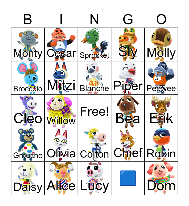 This bingo card has 24 images, a free space and 25 words: Olivia, Lucy, Blanche, Daisy, Molly, Monty, Broccolo, Cesar, Bea, Colton, Piper, Cleo, Chief, Robin, Mitzi, Jitters, Erik, Sprocket, Peewee, Willow, Dom, Alice, Groucho, Sly and 🟦.