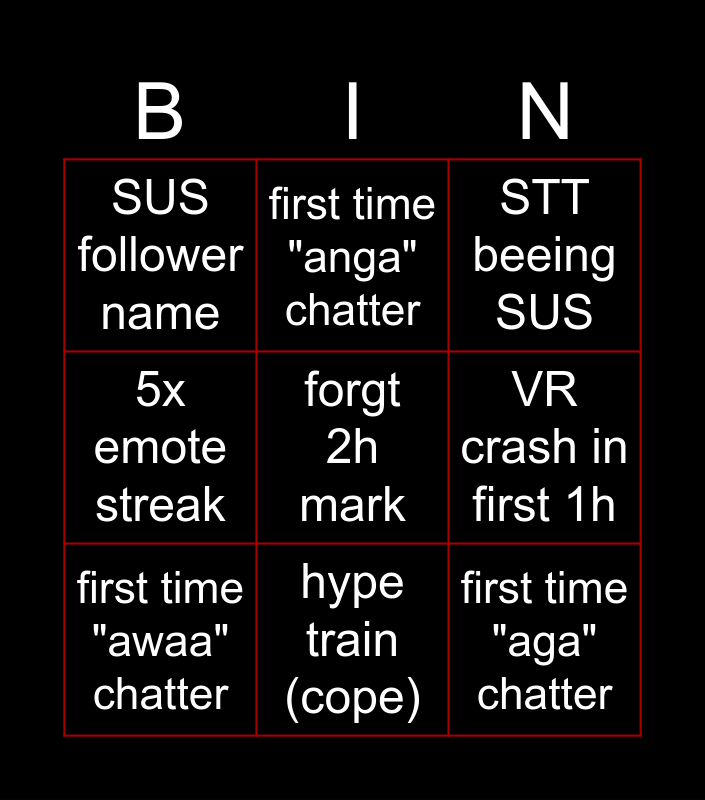 This bingo card has a free space and 8 words: VR crash in first 1h, STT beeing SUS, first time "anga" chatter, first time "awaa" chatter, SUS follower name, first time "aga" chatter, 5x emote streak and hype train (cope).