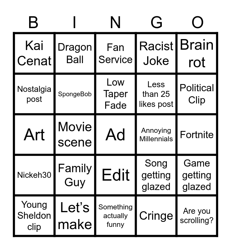 This bingo card has a free space and 24 words: Young Sheldon clip, Family Guy, Low Taper Fade, Cringe, Brain rot, Kai Cenat, Dragon Ball, Fan Service, Annoying Millennials, Fortnite, Art, SpongeBob, Song getting glazed, Game getting glazed, Nostalgia post, Let’s make, Something actually funny, Racist Joke, Political Clip, Nickeh30, Movie scene, Edit, Less than 25 likes post and Are you scrolling?.