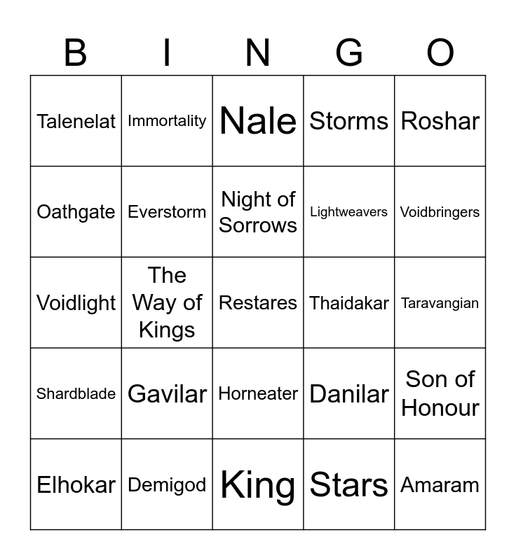 This bingo card has 25 words: Gavilar, King, Night of Sorrows, Elhokar, Roshar, Talenelat, Oathgate, Immortality, Thaidakar, Horneater, Lightweavers, Voidlight, Danilar, Son of Honour, Everstorm, Amaram, Taravangian, Nale, Voidbringers, The Way of Kings, Restares, Demigod, Shardblade, Storms and Stars.