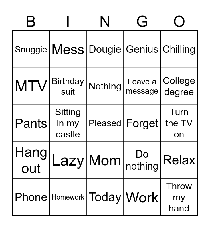 This bingo card has 25 words: Lazy, Today, Nothing, Phone, Chilling, Snuggie, MTV, Mess, Forget, Mom, Leave a message, Pants, Do nothing, Relax, Birthday suit, Throw my hand, Turn the TV on, Dougie, College degree, Sitting in my castle, Pleased, Homework, Hang out, Genius and Work.