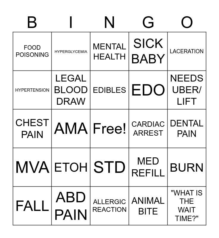 This bingo card has a free space and 24 words: ETOH, ABD PAIN, EDIBLES, FALL, LACERATION, FOOD POISONING, HYPERTENSION, HYPERGLYCEMIA, CARDIAC ARREST, STD, EDO, CHEST PAIN, MED REFILL, BURN, LEGAL BLOOD DRAW, ANIMAL BITE, DENTAL PAIN, MENTAL HEALTH, NEEDS UBER/ LIFT, AMA, "WHAT IS THE WAIT TIME?", MVA, SICK BABY and ALLERGIC REACTION.