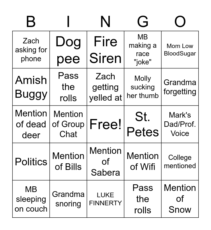 This bingo card has a free space and 24 words: Mention of Bills, Grandma snoring, Zach getting yelled at, MB sleeping on couch, Mom Low BloodSugar, Zach asking for phone, Amish Buggy, Dog pee, St. Petes, Mention of Sabera, Molly sucking her thumb, Mention of dead deer, Mention of Wifi, College mentioned, Pass the rolls, Pass the rolls, Mark's Dad/Prof. Voice, Fire Siren, Grandma forgetting, Mention of Group Chat, Mention of Snow, Politics, MB making a race "joke" and LUKE FINNERTY.