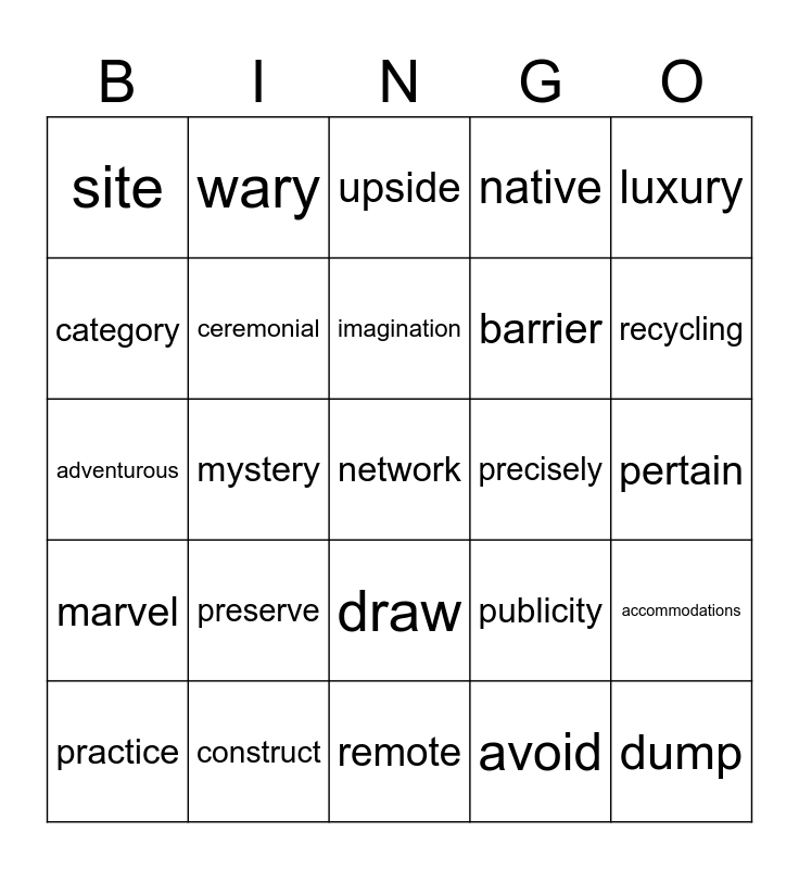 This bingo card has 40 words: accessible, adventurous, archeologist, ceremonial, construct, draw, imagination, institute, luxury, marvel, mystery, native, network, pertain, precisely, preserve, restriction, site, spectacular, upside, accommodations, avoid, barrier, category, concept, culprit, delicate, destination, dump, injure, pleasure, practice, principle, publicity, recycling, remote, strive, volunteer, wary and wilderness.