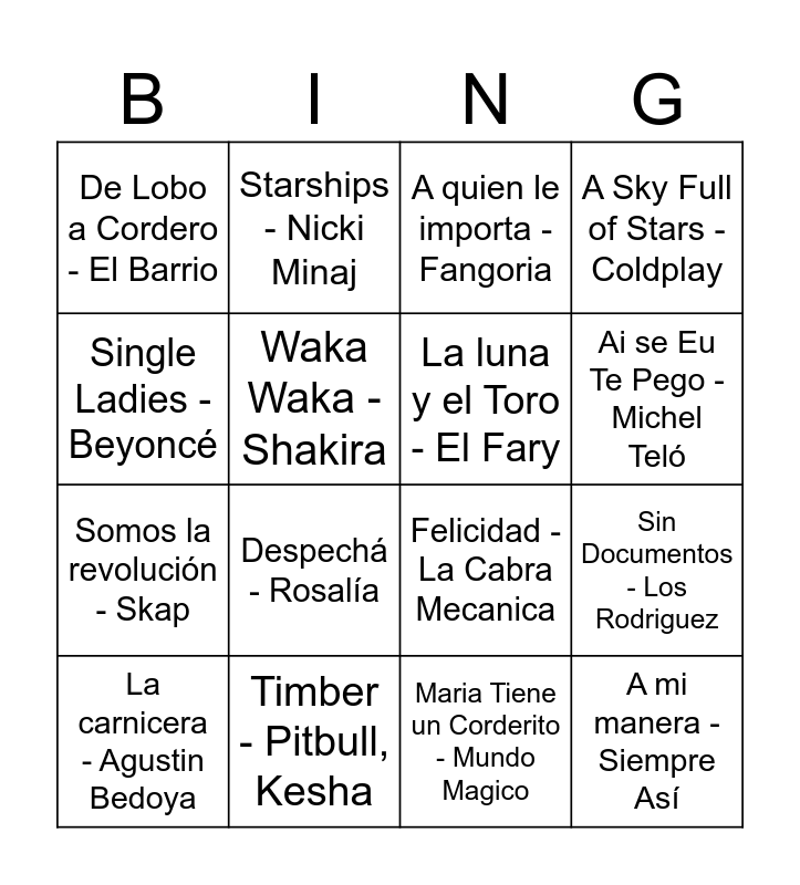 This bingo card has 76 words: El Toro Guapo - El Fary, Los lunes que Quedan - No te fallaré, A quien le importa - Fangoria, Gangnam Style - PSY, La mujer del pelotero - Baby Flores, Sra. Vaca y Sr. Toro - Luna creciente, Wake me up - Avicii, A fuego lento - Rosana, Mi rumba tarumba - Seguridad Social, Un año más - Mecano, Pastillas de Freno - Estopa, Tractor Amarillo - Zapato Veloz, Ai se Eu Te Pego - Michel Teló, Waka Waka - Shakira, Hombre de trabajo - Banda Carnaval, Sin Documentos - Los Rodriguez, Wannabe - Spice Girls, La carnicera - Agustin Bedoya, Bien Bonito - Maria Santos, Single Ladies - Beyoncé, Don't Stop Me Now - Queen, Felicidad - La Cabra Mecanica, La luna y el Toro - El Fary, Starships - Nicki Minaj, A Sky Full of Stars - Coldplay, La Vaca Lola - La Granja de Zenón, Danza Kuduru - Don Omar, Crazy - Gnarls Barkley, Despacito - Luis Fonsi, Daddy Yankee, El carnicero Vivaracho - Los inesperados, YMCA - Village People, Livin' la Vida Loca - Ricky Martin, Quan Somrius -, Let's Get Loud - Jennifer Lopez, Despechá - Rosalía, Somos la revolución - Skap, Matador - Los Fabulosos Cadillacs, Billie Jean - Michael Jackson, Maria Tiene un Corderito - Mundo Magico, Safe And Sound - Capital Cities, Scream & Shout - will.i.am, Britney Spears, Los Malditos Carniceros - Julio Vazquez, Rabiosa - Shakira, Pitbull, Get Busy - Sean Paul, El burrito Sabanero - David Bisbal, Macarena - River Re-Mix - Los Del Rio, Gimme! Gimme! Gimme! - ABBA, De Lobo a Cordero - El Barrio, Counting Stars - OneRepublic, La chica de Ayer - Nacha Pop, Amigos para Siempre - Los Manolos, Don't Start Now - Dua Lipa, Smells Like Teen Spirit - Nirvana, Gasolina - Daddy Yankee, I Follow Rivers - Lykke Li, The Magician, Vivir mi vida - Mark Antony, Ay Mamá - Rigoberta Bandinni, Nochentera - Vicco, La Fiesta - Pedro Capó, Rosalia - Con Altura, Bad Romance - Lady Gaga, Beggin' - Måneskin, Lunes - Estopa, Me colé en una fiesta - Mecano, Sarandonga - Lolita, Resistiré - Duo Dinamico, Timber - Pitbull, Kesha, Navidad Flamenca - María Peláe, Color esperanza - Diego Torres, La Marina esta Morena - Figa Flawas, Potra Salvaje - Isabel Aaiín, A mi manera - Siempre Así, Bailoteo - The Tyets, El baile del Gorila - Melody, Bailando - Enrique Iglesias and Cuando Zarpa el Amor - Camela.