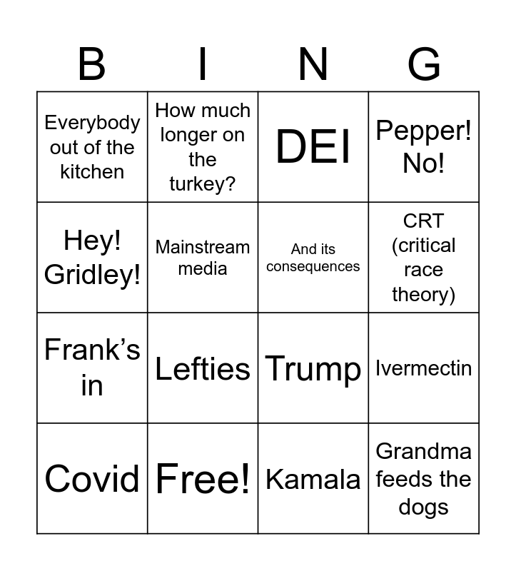 This bingo card has 16 words: Free!, Ivermectin, DEI, Everybody out of the kitchen, Frank’s in, How much longer on the turkey?, Trump, Kamala, Hey! Gridley!, Mainstream media, Covid, Pepper! No!, Lefties, CRT (critical race theory), And its consequences and Grandma feeds the dogs.