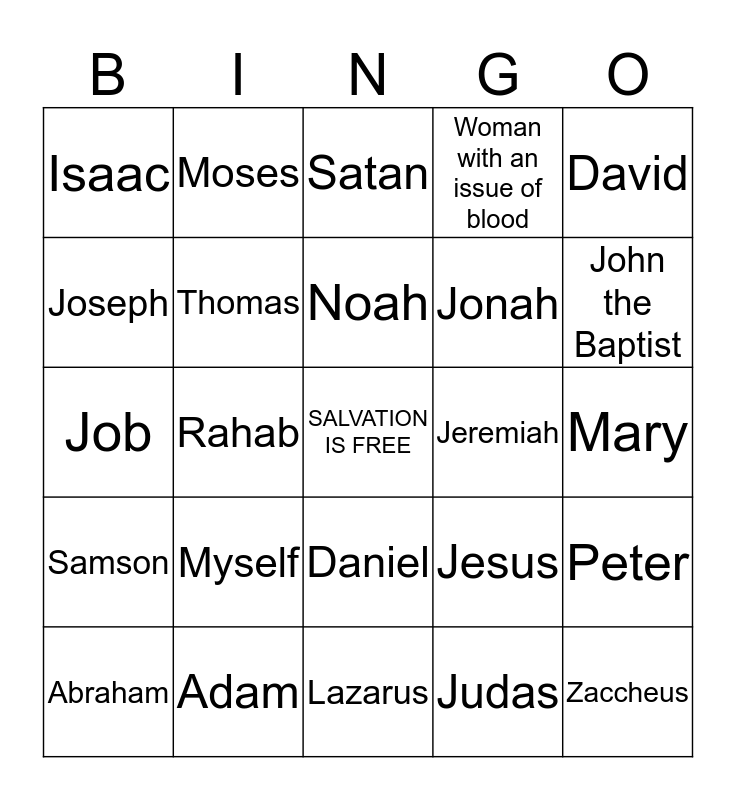 This bingo card has a free space and 24 words: Myself, Adam, Noah, Abraham, David, Isaac, Joseph, Moses, Jeremiah, Daniel, Jonah, Job, Jesus, Peter, Thomas, Judas, Mary, Satan, John the Baptist, Rahab, Zaccheus, Samson, Woman with an issue of blood and Lazarus.
