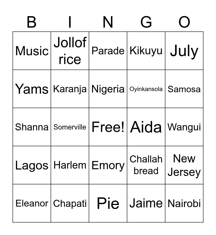 This bingo card has a free space and 24 words: Harlem, Chapati, Nigeria, Eleanor, July, Music, Yams, Jollof rice, Aida, Emory, Oyinkansola, Shanna, Challah bread, New Jersey, Karanja, Jaime, Wangui, Parade, Samosa, Somerville, Nairobi, Lagos, Kikuyu and Pie.