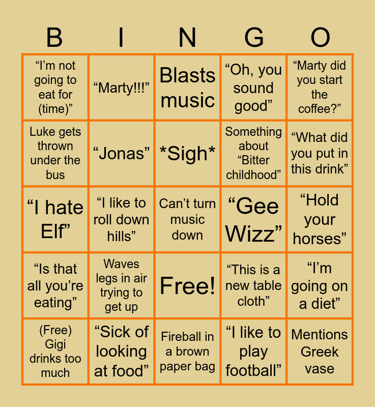 This bingo card has 26 words: Free!, “I like to play football”, *Sigh*, “Sick of looking at food”, “Marty did you start the coffee?”, “I’m not going to eat for (time)”, Luke gets thrown under the bus, “Marty!!!”, “Hold your horses”, “This is a new table cloth”, Something about “Bitter childhood”, “I hate Elf”, “I’m going on a diet”, (Free) Gigi drinks too much, “I like to roll down hills”, “What can I say”, “Oh, you sound good”, “Is that all you’re eating”, Blasts music, Can’t turn music down, “What did you put in this drink”, Fireball in a brown paper bag, “Gee Wizz”, Waves legs in air trying to get up, “Jonas” and Mentions Greek vase.