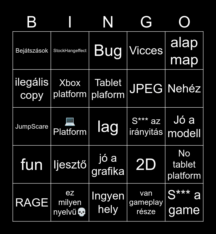 This bingo card has 25 words: fun, ez milyen nyelvű💀, lag, van gameplay része, alap map, Bejátszások, StockHangeffect, Bug, S*** az irányitás, No tablet platform, ilegális copy, Xbox platform, Ingyen hely, 2D, Nehéz, RAGE, 💻 Platform, Tablet plaform, JPEG, Jó a modell, JumpScare, Ijesztő, jó a grafika, Vicces and S*** a game.