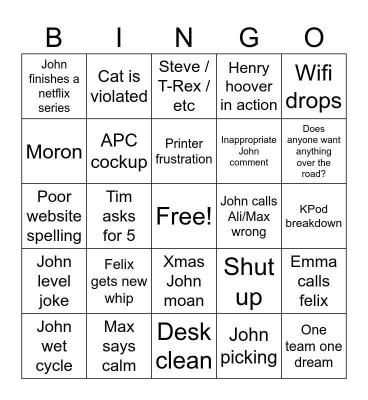 This bingo card has a free space and 58 words: Warehouse cockup, Max says calm, Great Stuff, John level joke, John picking, xmas song on John radio, APC cockup, HR joke, Inappropriate John comment, Driver calls in, Henry hoover in action, Someone pranked, Adella goes gangsta, Sales take a payment, Cuppa?, John finishes a netflix series, One team one dream, Wifi drops, Powercut, Printer frustration, John calls Ali/Max wrong, Steve / T-Rex / etc, John wet cycle, Emma calls felix, Problem with website customer, KPod breakdown, AquAid phone rings to coffee, Decision in new year, Does anyone want anything over the road?, Ali sigh, To be fair, Max and John bickering, APC moan, John argues with Lexie, John criminal joke, General john frustration, Phone quiet for 2 hours, Tim asks for 5, Poor website spelling, Adella flirty giggle, Felix gets new whip, Processing cockup, Shut up, Someones plant dies, Decorate xmas tree, Mark onto board, APC complaint from customer, Xmas John moan, Desk clean, FKN customers, Cat watering can, Ali takes a coffee order, ‘Just to let you know’, ‘Coffee, ancillary products and coffee machines’, Cat is violated, Big meeting, Moron and DOG.