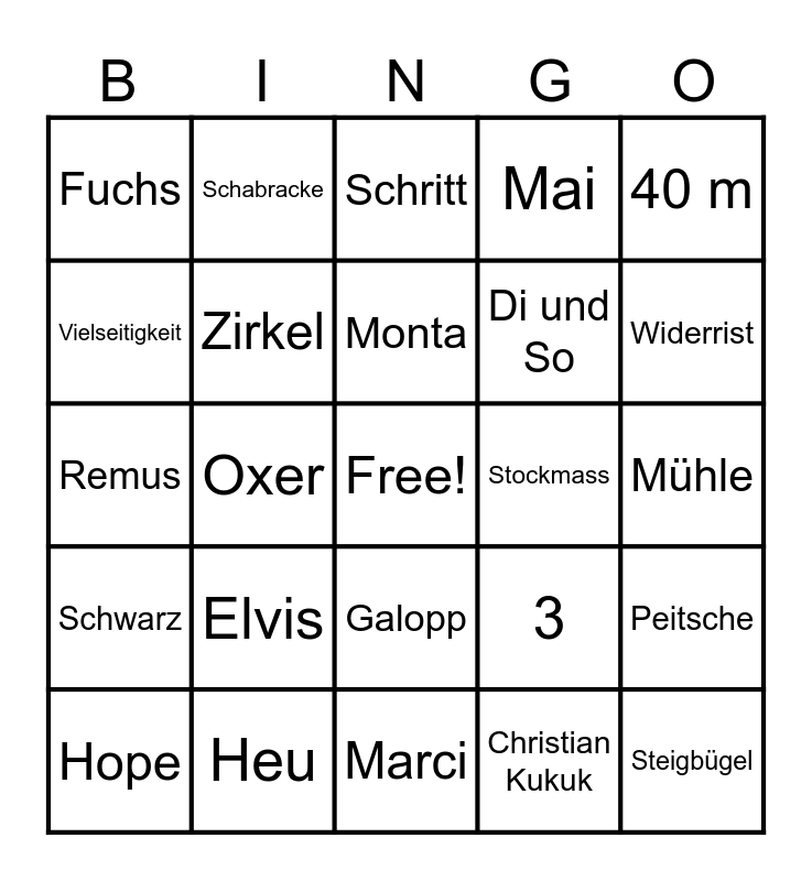 This bingo card has a free space and 25 words: Elvis, Marci, Monta, Hope, 40 m, Fuchs, Vielseitigkeit, Schabracke, Stockmass, Galopp, Di und So, Remus, 3, Peitsche, Zirkel, 1927, Mühle, Schritt, Widerrist, Oxer, Steigbügel, Heu, Schwarz, Mai and Christian Kukuk.