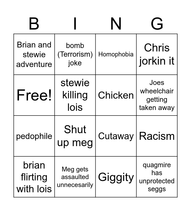 This bingo card has 16 words: Meg gets assaulted unnecesarily, Racism, Homophobia, Brian and stewie adventure, pedophile, bomb (Terrorism) joke, Cutaway, Giggity, Free!, stewie killing lois, brian flirting with lois, Chris jorkin it, Shut up meg, Joes wheelchair getting taken away, Chicken and quagmire has unprotected seggs.