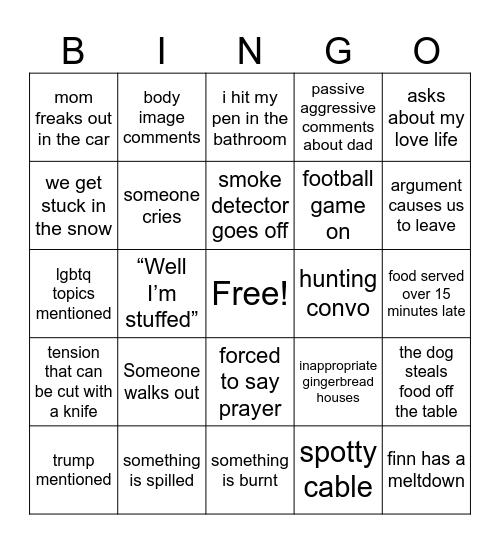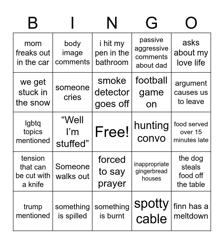 This bingo card has a free space and 24 words: Someone walks out, something is spilled, smoke detector goes off, trump mentioned, asks about my love life, mom freaks out in the car, we get stuck in the snow, body image comments, hunting convo, forced to say prayer, football game on, lgbtq topics mentioned, inappropriate gingerbread houses, the dog steals food off the table, someone cries, spotty cable, food served over 15 minutes late, i hit my pen in the bathroom, argument causes us to leave, “Well I’m stuffed”, finn has a meltdown, tension that can be cut with a knife, passive aggressive comments about dad and something is burnt.