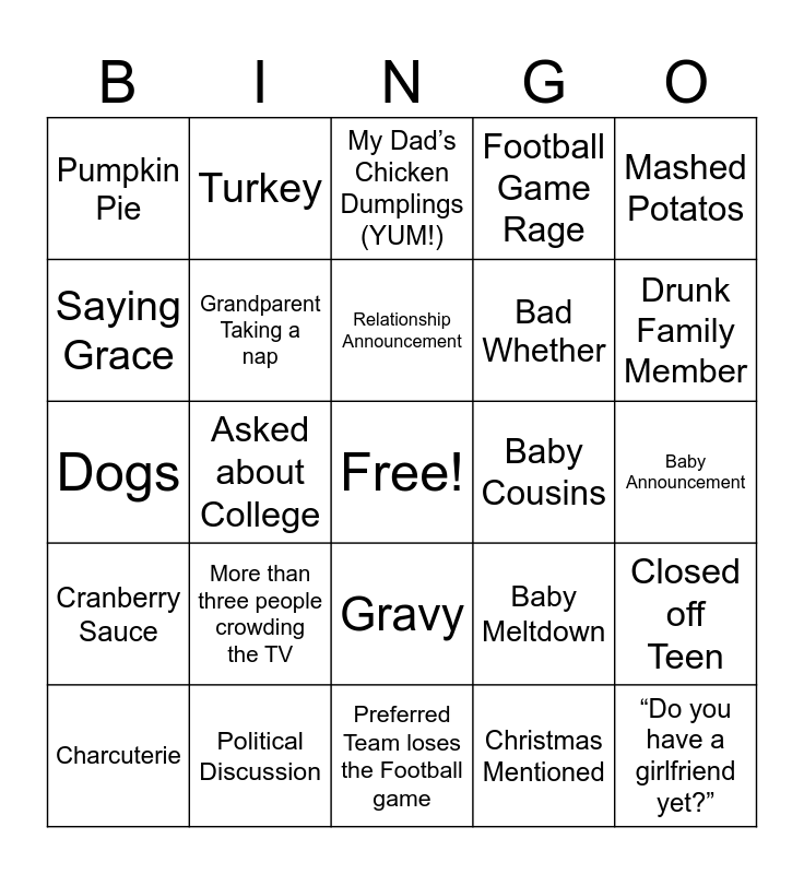 This bingo card has a free space and 24 words: More than three people crowding the TV, Political Discussion, Relationship Announcement, Charcuterie, Mashed Potatos, Pumpkin Pie, Saying Grace, Turkey, Baby Cousins, Gravy, Bad Whether, Dogs, Baby Meltdown, Closed off Teen, Grandparent Taking a nap, Christmas Mentioned, Baby Announcement, My Dad’s Chicken Dumplings (YUM!), Drunk Family Member, Asked about College, “Do you have a girlfriend yet?”, Cranberry Sauce, Football Game Rage and Preferred Team loses the Football game.