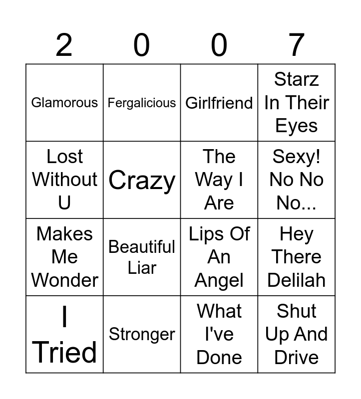 This bingo card has 30 words: Umbrella, Big Girls Don't Cry, Hey There Delilah, Say It Right, Glamorous, Girlfriend, The Way I Are, How to Save a Life, Stronger, Rockstar, What I've Done, I Tried, Chasing Cars, SexyBack, Beautiful Liar, Who Knew, Rehab, Shut Up And Drive, Keep Holding On, Lost Without U, Lips Of An Angel, Beautiful Girls, Fergalicious, Makes Me Wonder, Crazy, Starz In Their Eyes, Grace Kelly, Baby's Coming Back, Sexy! No No No... and What A Wonderful World.