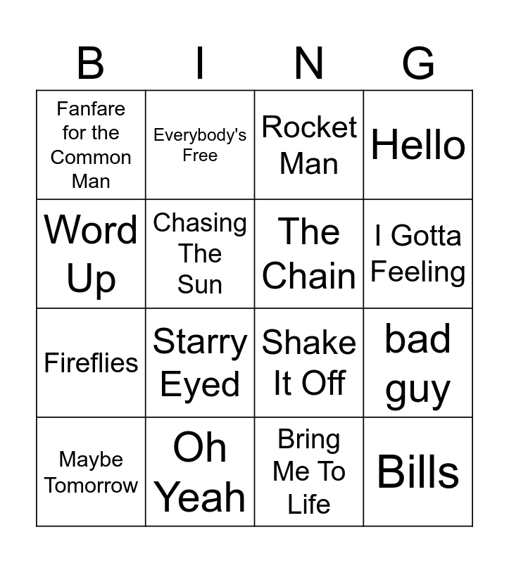 This bingo card has 30 words: Nothing Ever Happens, Out The Blue, bad guy, Insomnia, Fanfare for the Common Man, Rocket Man, The Chain, People Are People, Oh Yeah, Teardrop, Bring Me To Life, Maybe Tomorrow, Hey Brother, Money For Nothing, Starry Eyed, Just Got Paid, Bad Habits, Bills, The One And Only, Word Up, Shake It Off, Watermelon Sugar, Everybody's Free, Fireflies, Chasing The Sun, Hello, Thong Song, The Rhythm of the Night, I Gotta Feeling and Under the Bridge.