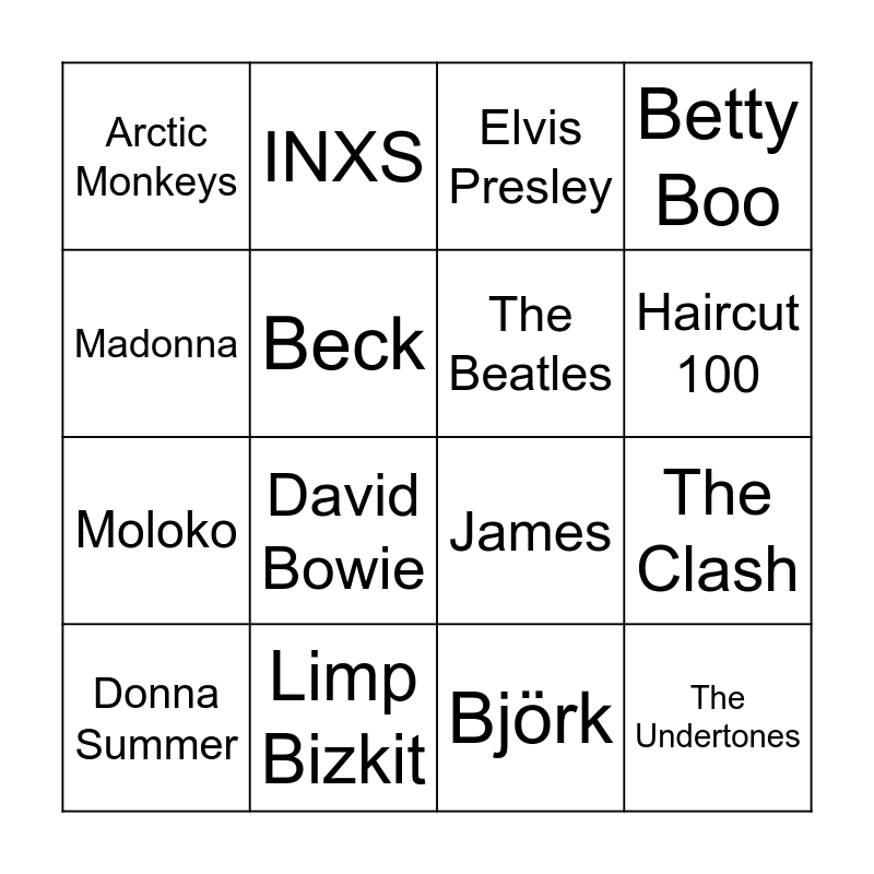 This bingo card has 31 words: artist, Queen, The Clash, Gorillaz, Arctic Monkeys, Elvis Presley, The Beatles, Radiohead, Limp Bizkit, Tears For Fears, Björk, Donna Summer, Erasure, Prince, David Bowie, Julian Cope, Cornershop, R.E.M., The Undertones, The Rolling Stones, Madonna, Coldplay, Eminem, INXS, Moloko, Beck, Betty Boo, James, Nina Simone, Haircut 100 and Lou Reed.