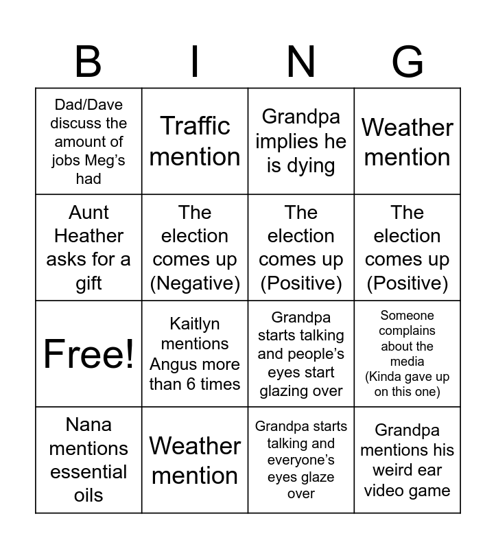 This bingo card has 20 words: Someone complains about the media (Kinda gave up on this one), Kaitlyn mentions Edinburgh (the first time), Grandpa implies he is dying, Someone wants to read Kaitlyn’s writing, Nana mentions essential oils, Aunt Heather asks for a gift, Weather mention, Dad/Dave discuss the amount of jobs Meg’s had, Free!, Traffic mention, Kaitlyn mentions Angus more than 6 times, Grandpa starts talking and people’s eyes start glazing over, The election comes up (Negative), Grandpa mentions his weird ear video game, The election comes up (Positive), Grandpa mentions something questionable, The election comes up (Positive), Weather mention, Grandpa starts talking and everyone’s eyes glaze over and Aunt Heather goes “Oo!”.