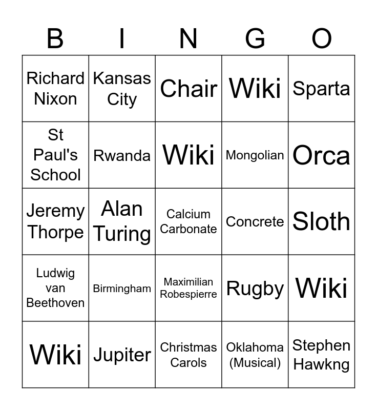 This bingo card has 30 words: Jupiter, Arabic, Alan Turing, Bakerloo Line, Richard Nixon, Chair, Rwanda, Maximilian Robespierre, Concrete, Christmas Carols, Sloth, Calcium Carbonate, Oklahoma (Musical), Stephen Hawkng, Orca, Prime Numbers, Rugby, Ludwig van Beethoven, Birmingham, Sparta, Jeremy Thorpe, Engineering, Kansas City, Mongolian, St Paul's School, Wiki, Wiki, Wiki, Wiki and Wiki.