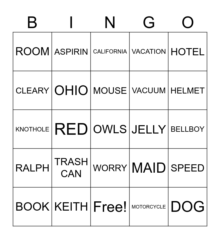 This bingo card has 26 words: RALPH, KEITH, MOUSE, MOTORCYCLE, HOTEL, ROOM, OHIO, CALIFORNIA, VACUUM, DOG, CLEARY, RED, Free!, MAID, BELLBOY, PEANUT BUTTER, ASPIRIN, WORRY, VACATION, SPEED, KNOTHOLE, TRASH CAN, OWLS, JELLY, HELMET and BOOK.