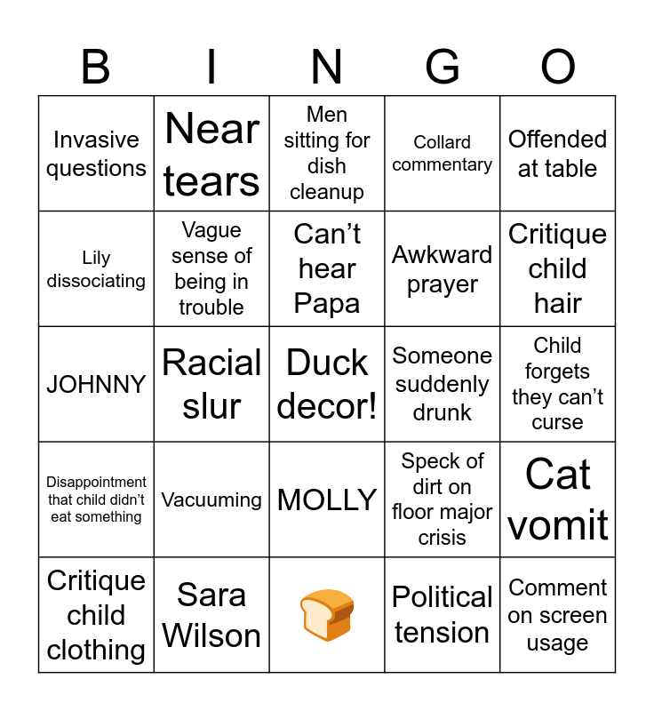 This bingo card has a free space and 24 words: Vacuuming, Sara Wilson, Can’t hear Papa, Critique child clothing, Offended at table, Invasive questions, Lily dissociating, Near tears, Someone suddenly drunk, MOLLY, Awkward prayer, JOHNNY, Speck of dirt on floor major crisis, Cat vomit, Vague sense of being in trouble, Political tension, Child forgets they can’t curse, Men sitting for dish cleanup, Critique child hair, Racial slur, Comment on screen usage, Disappointment that child didn’t eat something, Collard commentary and 🍞.