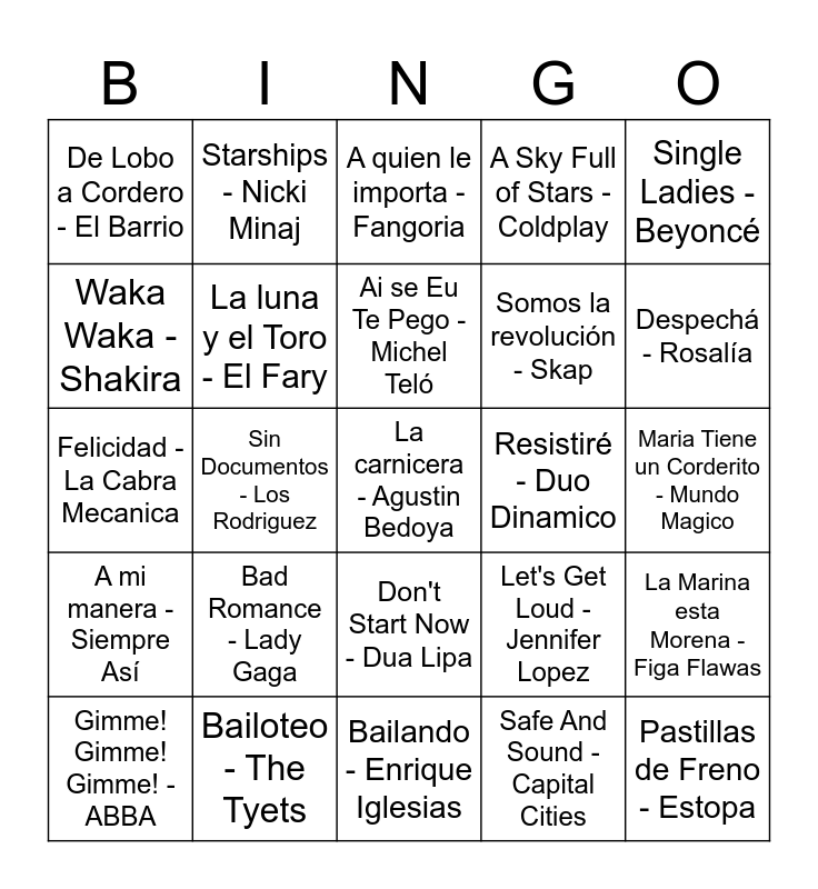 This bingo card has 75 words: El Toro Guapo - El Fary, Los lunes que Quedan - No te fallaré, A quien le importa - Fangoria, Gangnam Style - PSY, La mujer del pelotero - Baby Flores, Sra. Vaca y Sr. Toro - Luna creciente, Wake me up - Avicii, A fuego lento - Rosana, Mi rumba tarumba - Seguridad Social, Un año más - Mecano, Pastillas de Freno - Estopa, Tractor Amarillo - Zapato Veloz, Ai se Eu Te Pego - Michel Teló, Waka Waka - Shakira, Hombre de trabajo - Banda Carnaval, Sin Documentos - Los Rodriguez, Wannabe - Spice Girls, La carnicera - Agustin Bedoya, Bien Bonito - Maria Santos, Single Ladies - Beyoncé, Don't Stop Me Now - Queen, Felicidad - La Cabra Mecanica, La luna y el Toro - El Fary, Starships - Nicki Minaj, A Sky Full of Stars - Coldplay, La Vaca Lola - La Granja de Zenón, Danza Kuduru - Don Omar, Crazy - Gnarls Barkley, Despacito - Luis Fonsi, Daddy Yankee, El carnicero Vivaracho - Los inesperados, YMCA - Village People, Livin' la Vida Loca - Ricky Martin, Quan Somrius -, Let's Get Loud - Jennifer Lopez, Despechá - Rosalía, Somos la revolución - Skap, Matador - Los Fabulosos Cadillacs, Billie Jean - Michael Jackson, Maria Tiene un Corderito - Mundo Magico, Safe And Sound - Capital Cities, Scream & Shout - will.i.am, Britney Spears, Los Malditos Carniceros - Julio Vazquez, Rabiosa - Shakira, Pitbull, Get Busy - Sean Paul, El burrito Sabanero - David Bisbal, Macarena - River Re-Mix - Los Del Rio, Gimme! Gimme! Gimme! - ABBA, De Lobo a Cordero - El Barrio, Counting Stars - OneRepublic, La chica de Ayer - Nacha Pop, Amigos para Siempre - Los Manolos, Don't Start Now - Dua Lipa, Smells Like Teen Spirit - Nirvana, Gasolina - Daddy Yankee, I Follow Rivers - Lykke Li, The Magician, Vivir mi vida - Mark Antony, Ay Mamá - Rigoberta Bandinni, Nochentera - Vicco, La Fiesta - Pedro Capó, Rosalia - Con Altura, Bad Romance - Lady Gaga, Beggin' - Måneskin, Lunes - Estopa, Me colé en una fiesta - Mecano, Sarandonga - Lolita, Resistiré - Duo Dinamico, Timber - Pitbull, Kesha, Navidad Flamenca - María Peláe, Color esperanza - Diego Torres, La Marina esta Morena - Figa Flawas, A mi manera - Siempre Así, Bailoteo - The Tyets, El baile del Gorila - Melody, Bailando - Enrique Iglesias and Cuando Zarpa el Amor - Camela.